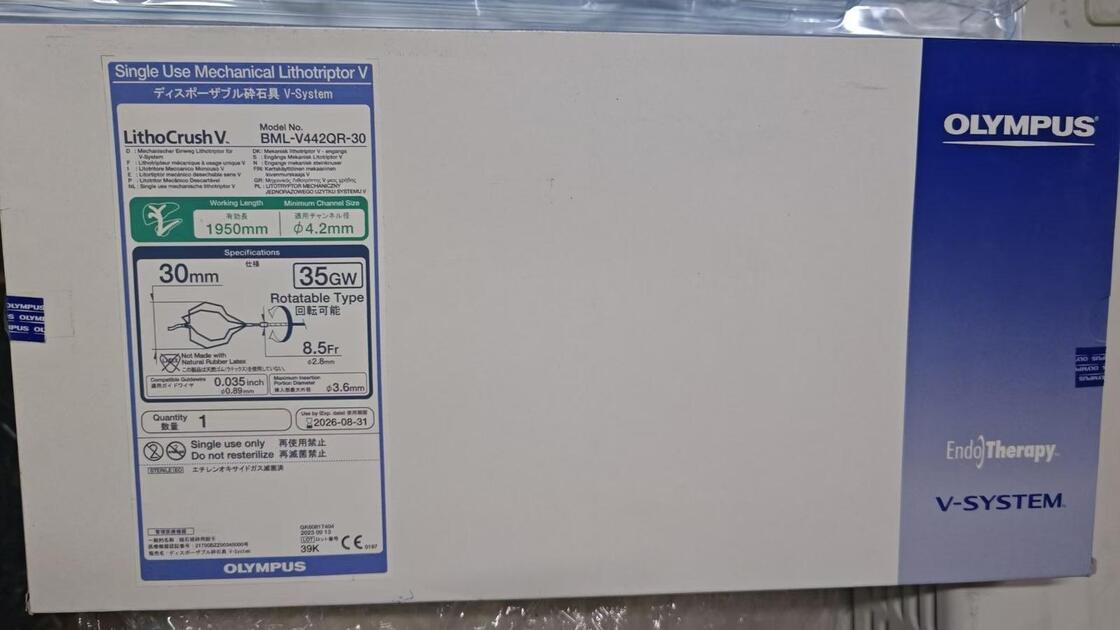El Litotriptor Mecánico de un Solo Uso V‑System Olympus BML‑V442QR‑30 es un dispositivo médico utilizado en procedimientos endoscópicos para triturar mecánicamente cálculos (cálculos), especialmente en el tracto biliar, durante cirugías mínimamente invasivas. Está diseñado para ser utilizado una sola vez y luego desecharse, en lugar de reutilizarse.